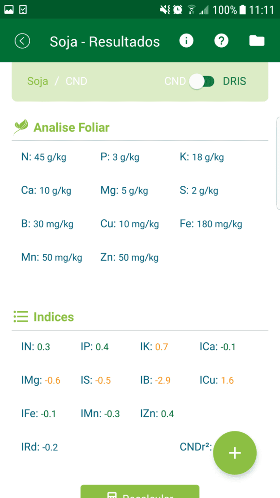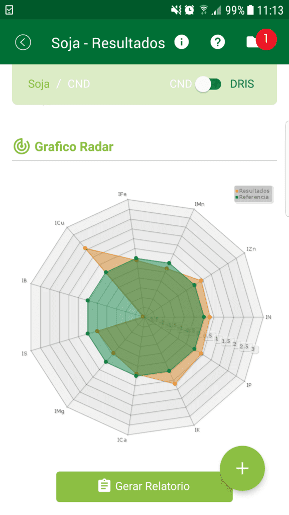 Depois, ele deve escolher o método de análise (DRIS ou CND, veja quadro abaixo) e clicar no botão “enviar”. Em seguida, aparecerão os índices nutricionais em formato de gráficos de barra e radar. Ele deve clicar, então, em “gerar relatório” para abrir um formulário a ser preenchido sobre dados da propriedade, em talhão ou lavoura, como área plantada, data da coleta da folha diagnóstica e algum manejo realizado na área. Finalmente, ao clicar em “baixar”, os resultados gerados são armazenados no dispositivo em forma de relatório que poderá ser compartilhado por e-mail ou programas de mensagens, como o WhatsApp.