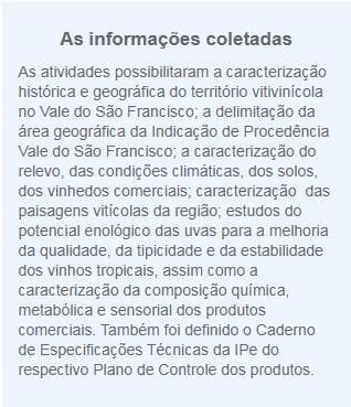 A parceria entre ciência e setor produtivo resultou no pedido de reconhecimento da Indicação de Procedência Vale do São Francisco para vinhos finos tranquilos e espumantes. O trabalho conjunto permitiu o pioneirismo internacional na estruturação de uma Indicação Geográfica de vinhos tropicais. Em dezembro, foi depositada a Indicação de Procedência (IP) do Vale do São Francisco no Instituto Nacional da Propriedade Industrial (INPI), baseada em requisitos equivalentes aos da União Europeia.