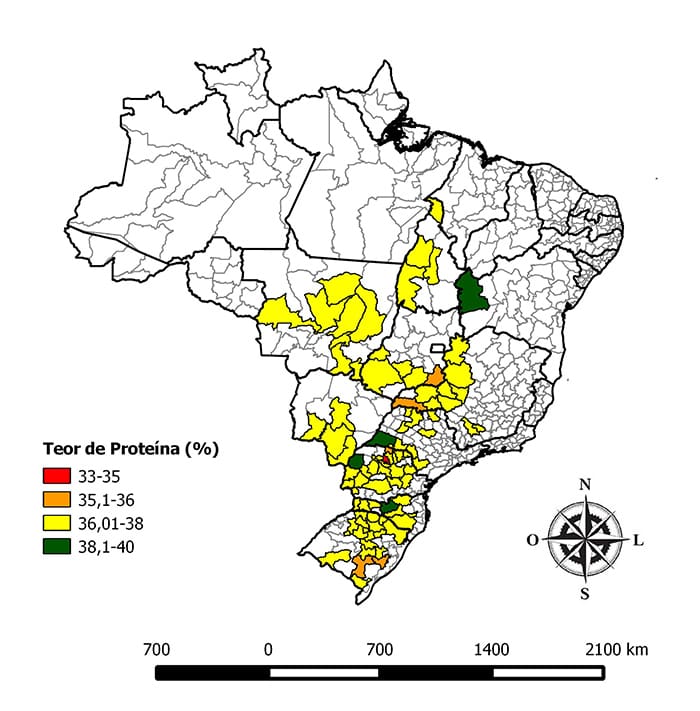 Na safra 2016/17 o teor médio de proteína nos grãos de soja variou de 32,03% a 41,35% nas 903 amostras analisadas. O estado que apresentou a maior média no teor de proteína foi a Bahia, com 38,16%, e o Paraná foi o estado com a menor média: 36,74%.