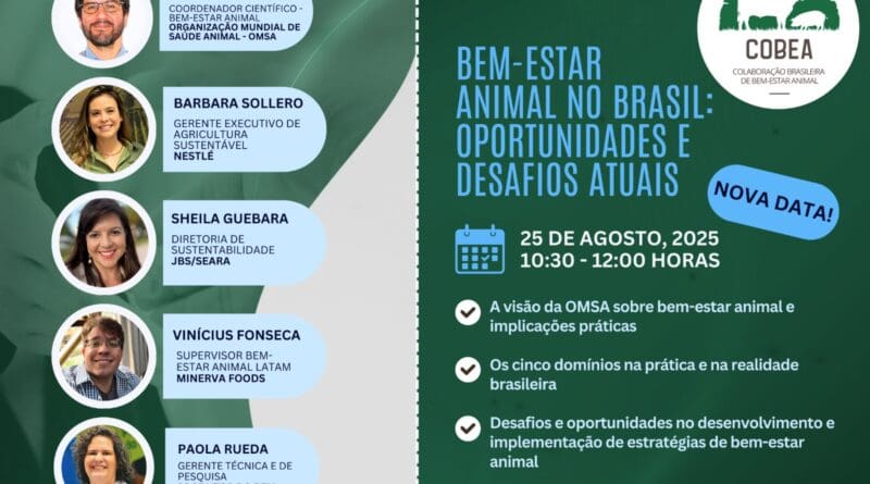 O webinar “Bem-estar animal no Brasil: Oportunidades e desafios atuais”, organizado pela Colaboração Brasileira de Bem-Estar Animal (COBEA), teve sua nova data divulgada e será realizado no dia 25 de agosto (segunda-feira) às 10h30 (horário de Brasília). O evento abordará o papel de destaque do país hoje no mundo em relação ao tema e os avanços significativos ocorridos no setor produtivo da cadeia. O webinar será transmitido pela plataforma Zoom, no link https://us06web.zoom.us/j/81852737420.