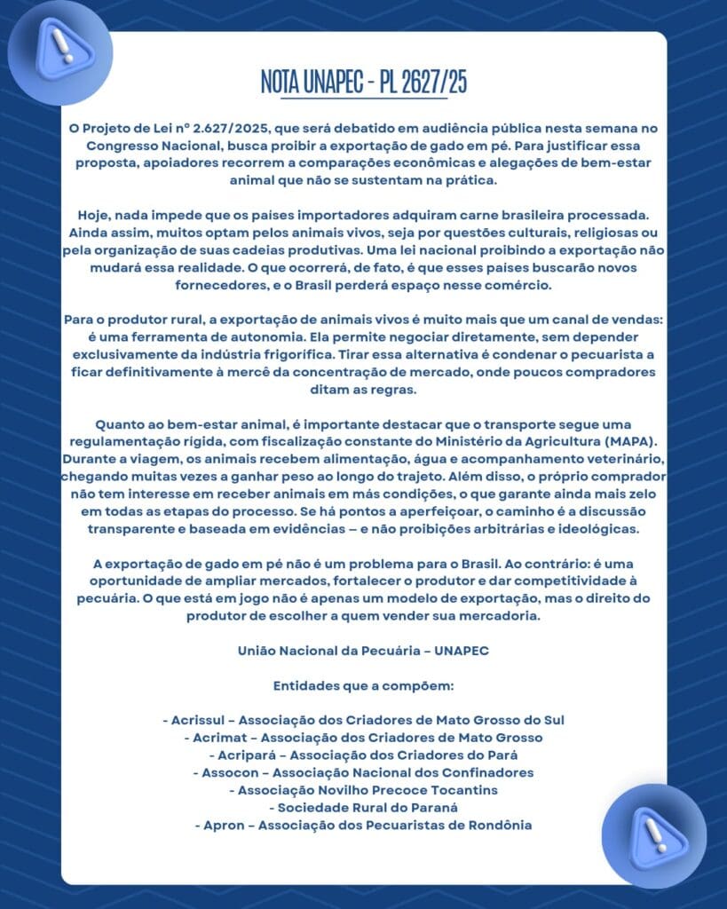 A União Nacional da Pecuária (UNAPEC), que reúne entidades de vários estados, incluindo a Associação dos Pecuaristas de Rondônia (APRON), divulgou nota oficial contra o Projeto de Lei 2.627/2025, que tramita no Congresso Nacional e prevê a proibição da exportação de gado em pé.