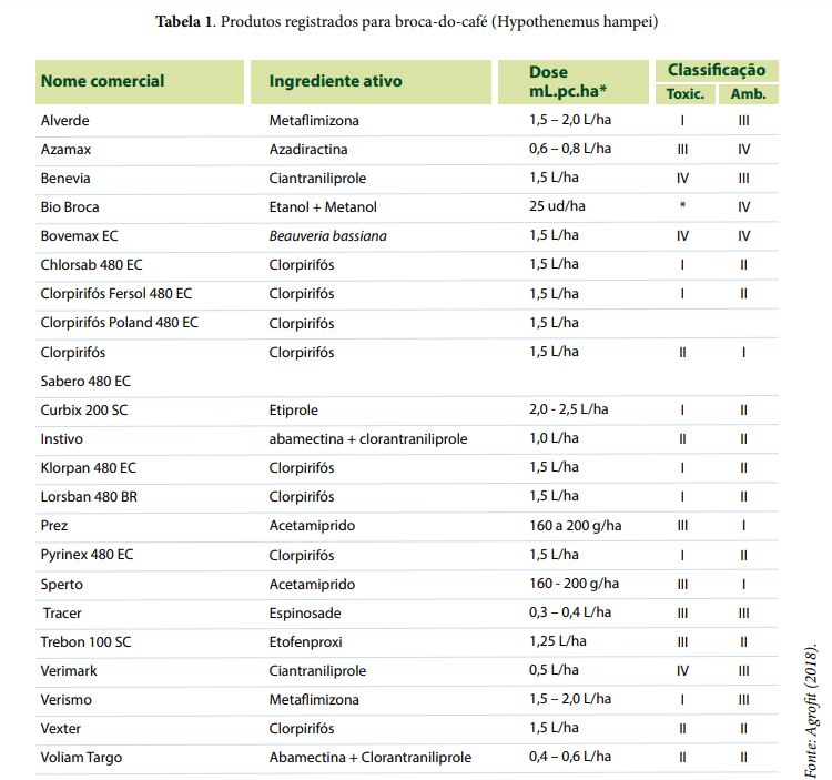 Somente em 2016 foram registrados pelo Ministério da Agricultura, Pecuária e Abastecimento (Mapa) dois inseticidas para esta praga: Benevia, que possui como ingrediente ativo o Ciantraniliprole e Voliam Targo formulado a partir das moléculas Clorantraniliprole e Abamectina. Além desses produtos, vários outros foram registrados para broca-do-café, conforme relacionados na Tabela 1.