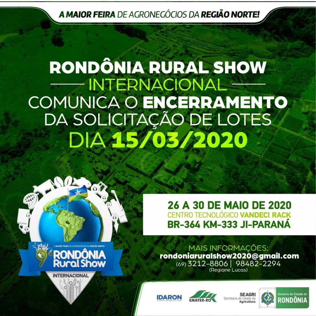 As empresas interessadas em expor na maior feira de tecnologia e do agronegócio da região Norte tem até o próximo domingo, dia 15 de março, para solicitar o lote da 9ª edição da Rondônia Rural Show Internacional. A 9ª edição está prevista para acontecer de 26 a 30 de maio, no Centro Tecnológico Vandeci Rack, em Ji-Paraná.