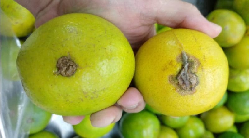 O cancro cítrico é uma das principais ameaças à produção, é causado pela bactéria Xanthomonas citri subsp. citri e afeta todas as espécies e variedades de citros de importância comercial.