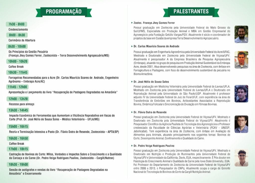 O evento é realizado pelo Grupo de Estudos em Pecuária de Corte da Universidade Federal do Acre (Gespec – Ufac), RA Consultoria e Animallia (Empresa Jr de Medicina Veterinária) com as seguinte palestras: