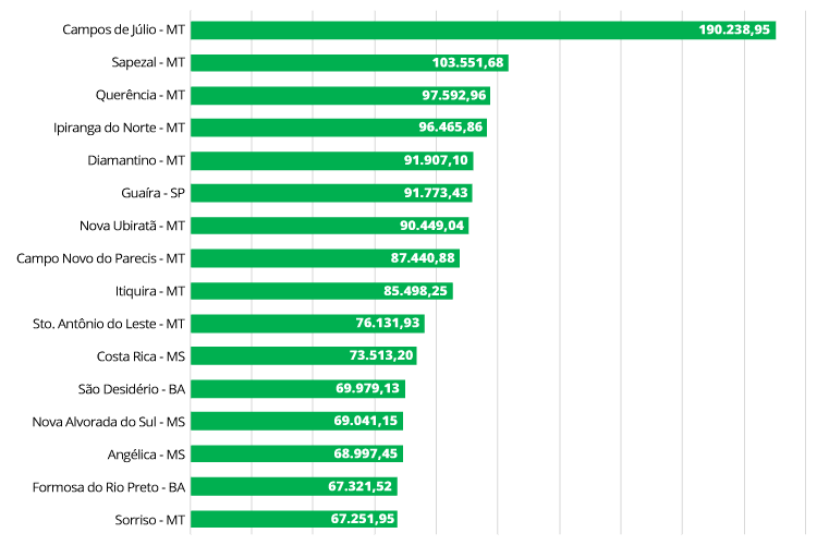 Os dados da Pesquisa Agrícola Municipal (PAM), divulgada em setembro do ano passado pelo IBGE, mostram que São Desidério (BA), Sapezal (MT) e Sorriso (MT) são os municípios com o maior valor de produção agrícola do país. São os principais produtores de algodão herbáceo, soja, milho, entre outros grãos, e campeões de geração de riqueza no campo.