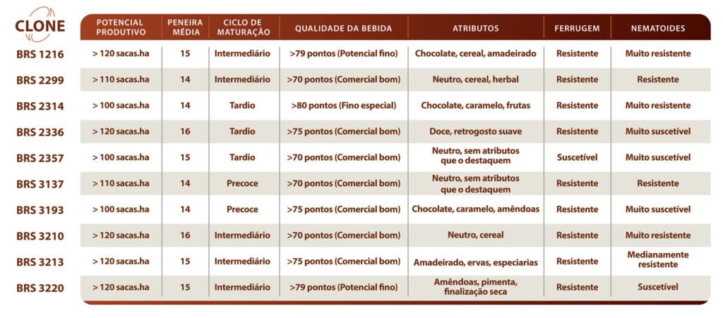 Os clones BRS 1216, BRS 3213, BRS 3220 foram selecionados devido à sua maior estabilidade produtiva, ou seja, são capazes de manter uma alta produção em diferentes ambientes. O clone BRS 2336 e o BRS 3210 foram escolhidos pela sua maior peneira, característica associada ao maior tamanho dos grãos. BRS 3213, BRS 3193 e BRS 2299 são clones que se destacam pela rusticidade (desempenho em ambientes desfavoráveis) e resistência à ferrugem e a nematoides. O clone BRS 2357 é uma planta de pequeno porte, facilitando a colheita mecanizada. Já o BRS 2314 foi destaque na qualidade de bebida, apresentado pontuação equivalente a cafés especiais.