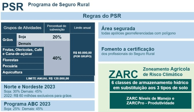 No seguro rural, a expectativa é atingir um montatnte de R$ 2 bilhões em 2023. A partir do próximo ano, o valor de subvenção nas regiões Norte e Nordeste será de 30% no caso de plantio da soja e de 45% para as demais culturas. No caso de produtores que aderirem ao Programa ABC, os valores serão de 25% para soja e 45% para as demais.