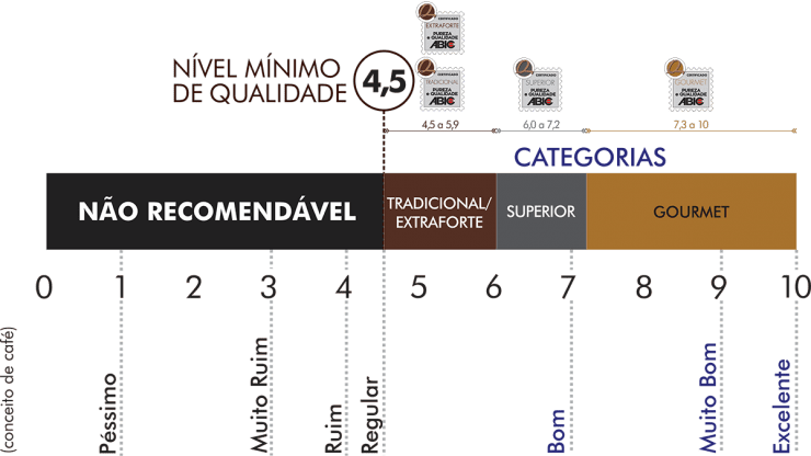 A ABIC considera as seguintes  categorias de qualidade do café e o que determina é a faixa de nota de Qualidade Global obtida pelo produto, numa escala de 0 a 10: