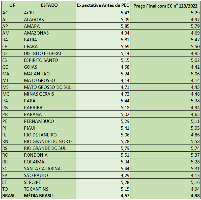 Vale ressaltar, porém, que tal estimativa não considera a possibilidade, também decorrente da EC nº 123/2022, de redução do preço do biocombustível aos estados que outorgarem créditos tributários de ICMS, podendo chegar o preço médio do litro de etanol hidratado a até R$ 4,04.