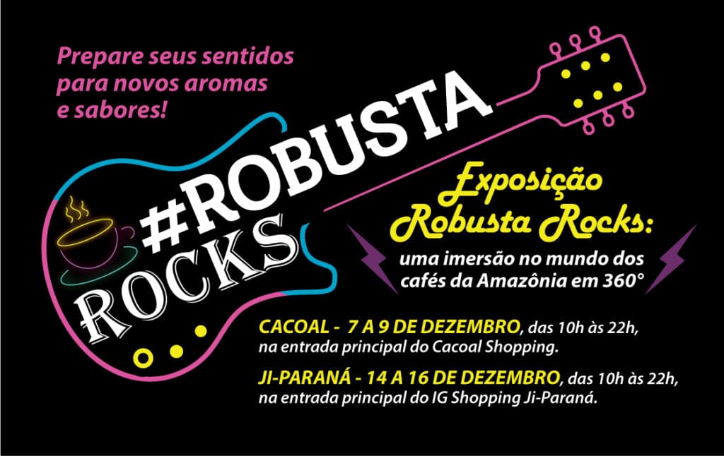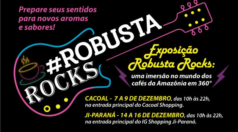 Uma imersão no mundo dos cafés da Amazônia em 360°, esta é a proposta da exposição Robusta Rocks, que acontecerá de 7 a 9 de dezembro, das 10h às 22h, na entrada principal do Cacoal Shopping e de 14 a 16 de dezembro, no mesmo horário, na entrada principal do IG Shopping Ji-Paraná.