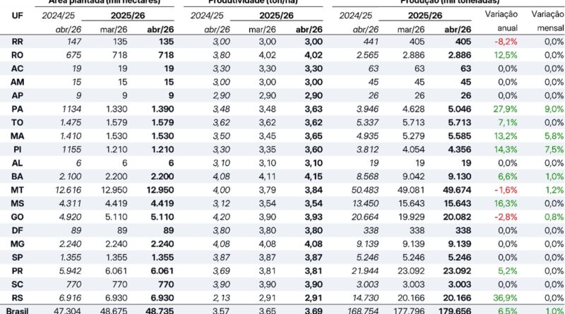 A estimativa para a safra de soja neste mês de abril da StoneX, empresa global de serviços financeiros, mudou pouco em relação ao mês anterior. A safra brasileira de soja 2025/26 segue com perspectiva de recorde, e agora foi revisada positivamente em 1%, chegando a 179,7 milhões de toneladas.