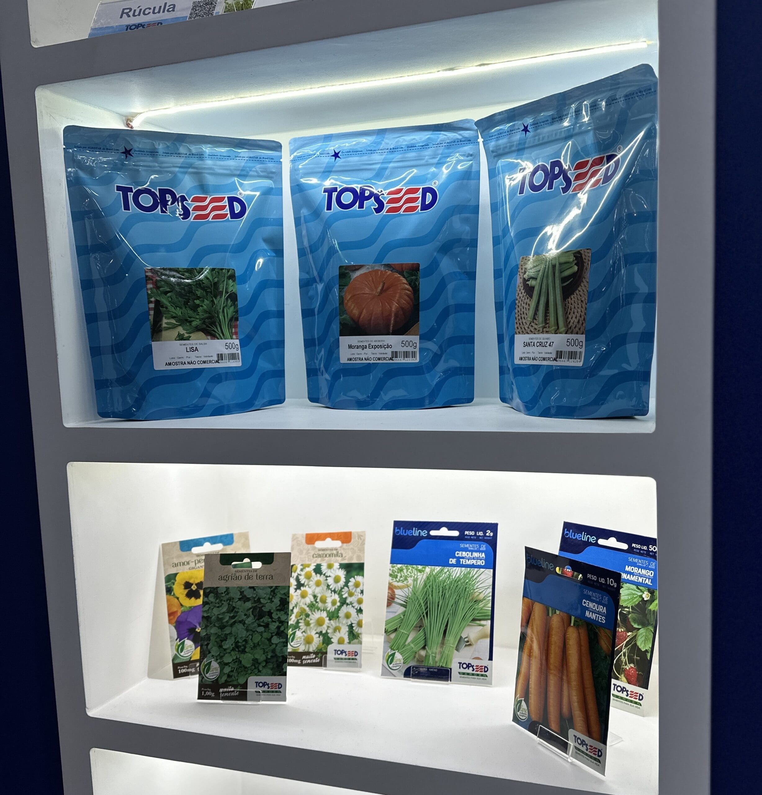 No estande, os visitantes conferiram as tradicionais embalagens Topseed de 500g, para o cultivo profissional de microverdes, e os novos envelopes de 5g Topseed Garden, para o plantio doméstico. De acordo com Scarpat, as duas marcas possuem 10 variedades de microverdes já consolidadas, como o agrião da terra, o alho-poró, beterraba, brócolis, coentro, couve-manteiga, mostarda, rabanete, repolho-roxo e rúcula, e agora contam também com quatro lançamentos, o agrião-pimenta, a cenoura, a cebola e o manjericão Genovese.