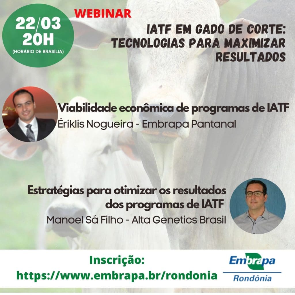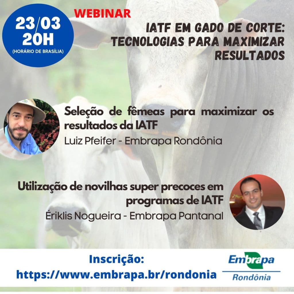 O evento on-line “Inseminação artificial em tempo fixo – IATF em Gado de Corte: Tecnologias para maximizar retornos” será realizado nos dias 22 e 23/3, a partir das 20h (horário de Brasília), no canal da Embrapa no Youtube. A inscrição é gratuita e pode ser feita no portal da Embrapa Rondônia. Nos dois dias de evento os participantes poderão interagir com os convidados por meio do chat. O webinar é voltado para técnicos, produtores, acadêmicos da área e demais interessados no tema.